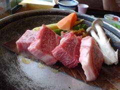 いよいよ問題の昼飯である。レストランは全席禁煙座敷で、広いし窓大きいし、飛騨の山が見渡せるし、こりゃええわ。汚職事件、ぢゃないお食事券を渡してしばし待つと、来た来た来ました。まずざいご膳、そしてステーキだ。食前ジュースと言うのが付いていて、これがおいしいのなんのって。そばみたいなうどんもうまかったし、勿論お肉(飛騨牛である)うまかった。言うことなし。