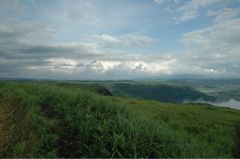 帰りには黒雲がごろごろいい出して、頂上駅戻ったら雨が遂に降り出した。ショック! ロープウェイで麓駅まで降り、バイクに戻る。幸い雨のかからない軒下に止めたのでよかったが、これは困った。夕立のような雨なので待てば止むと思い、3時から1時間ひたすら待つが止まない。目の前に青空があるのにだ。それでも小降りになったので出発した。本日の宿、菊池温泉城山荘に向かう。57号を走る予定だったが、渋滞がひどいのでやめてやまなみハイウェイを戻り、ミルクロード経由で走った。雨もやんだので大観峰によった。阿蘇の山の全貌をしっかり見て、九州に来たこを実感する。
