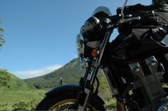 阿蘇に向かうやまなみハイウェイまで引き返し、壮大な高原地帯を走りぬけると57号線に到達した。が、そこは渋滞、やはり熊本に向かう幹線道路、交通量が多いぞ。阿蘇駅前で曲がって、とりあえずお約束の草千里に向かった。気持ちのいい道だが、観光客の車が多く、バイクを止めて写真をというわけにはいかないな。米塚が見えてきたので、それぐらいはせめて写真と思ったが、止められずそのまま草千里展望台まで来てしまった。車の多いこと多いこと、入りきらない車が路上駐車していてまるでイオンショッピングセンターの新店開店状態だ。それでも火山博物館のある駐車場は有料なせいかまだ入れた。100円払ってバイクは奥の方に止めてと言われ、奥の方に行ったら族車がいっぱいいた。危なそうな人たちの集まりがこんなところで昼間からあるんかい。九州男児恐るべし。落ちついてバイクから離れられず、自販機でお茶を買って飲んだり、近くを写真撮影するくらいしか出来なかった。それも空を見るとなんだか雲行きが怪しい。黒い雲がぽつりぽつりと流れてくのだ。どうも局地的なにわか雨がきそうなので困ったな。これから地獄温泉に行って仙酔峡と思ったがどうするか。地獄温泉の方角の空が曇ってきており、天気が心配なのであきらめて仙酔峡に行くことにした。