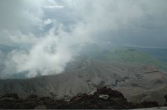 しかし、走り出すと仙酔峡の方角も天気が怪しくなってきたぞ。空を気にしていたら、米塚を通過してしまった。くそ、今度こそ写真だけでもと思っていたのに残念。こうなったら仙酔峡は意地でも行ってやる。57号線から線路を横切って仙酔峡道路に入る。普通の生活道路のような道だが、山の方に登って行くとあたりの見晴らしは素晴らしいものに変る。でもまあ、天気がいまいちだから、この前来たみたいな感動はないな。ロープウェイ駅に着いたが、天気が心配なので建物の軒の下に止めた。カメラを持って建物に入ると、おいおい、ここ本当に営業してるのかよとあきれるようなひどい状態。かつては土産物屋さんや飲食店が入っていただろうスペースは物置と化し、申し訳なさ程度に写真が飾ってある。階段を上がって2階に行くと、一応営業しているのが感じられるので一安心。とはいえ、受付には年配の女の人が一人いるだけで、何だかとっても家内製工業な感じだ。切符は往復1500円、一人前取るなー高いなー。丁度出発の時間なのでゴンドラに乗り込む。他にもファミリーやら年配の夫婦が乗り込んだ。頂上駅までゆっくり進む。眼下に広がる光景は素晴らしい。来てよかった。頂上駅に着くと、火口まで歩くのだが、急な斜面を延々20分くらい歩き続けてしんどかった。皮上下の穴から風が入るからまだいいが、それでも火口に着いたらベンチに座り込んでへとへとだった。火口はモクモクと噴煙を上げており、調査用のヘリけたたましい音を立ててが飛んでいる。すげーな、活火山は本当にすげえ。登ってきたかいがあったな。でも向こう火口付近にも観光バスやら観光客がうじゃうじゃ見えるんですけど。あれ、ひょっとして阿蘇道路から行った方が近かったよ。こんなに歩いて登らなくてもいいみたいだし。今度はあっちから行こう。(多分前もそう思ったに違いないが)