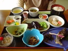 食事処いわつつじ 全席禁煙座敷のゆったりできる食事処です。大きな窓から飛騨の山々が見渡せるので気持ちよく食事が出来ますね。 |