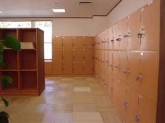 ロッカールーム 外国の映画に出てきそうなとても立派なロッカー室です。畳の休憩所も併設しています。自動販売機も並んでいます。 |