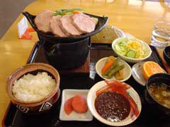 明宝ハムステーキ 見よ、これが明宝ハムだ。この世にこれよりうまいハムがあるかどうか。鉄板の上でジュージュー、肉厚でおいしいです。 |