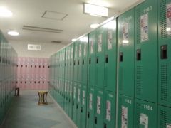 ロッカー付近 温泉プールともに1階にあるので階段を下りるとタオルセットの引換所があり、そこでフロントで渡されたカード出して、手提げに入ったタオルセット(浴衣も入ってます)をもらいます。ロッカー室は市民プールのそれで、ハンガーも入っております。 |