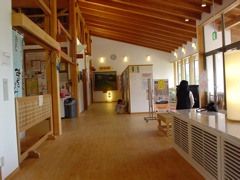 受付とホール 木のぬくもりが感じられる造りの内部です。ホールも広く、休憩スペースが十二分に取られているのがいいですね。売店もあります。 |