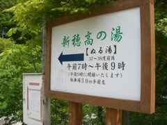 温泉へ 大きなのれんの近くにある駐車場から歩いて少し、この案内看板があります。川には橋が架かっており、その橋を渡って温泉入口に至ります。 |